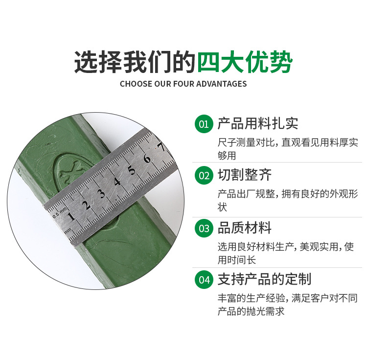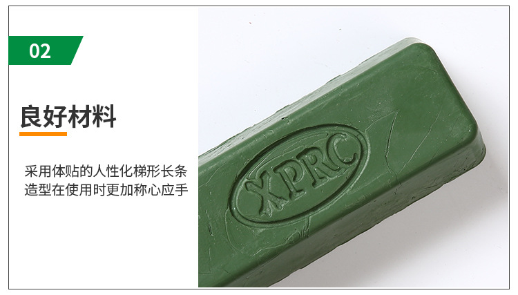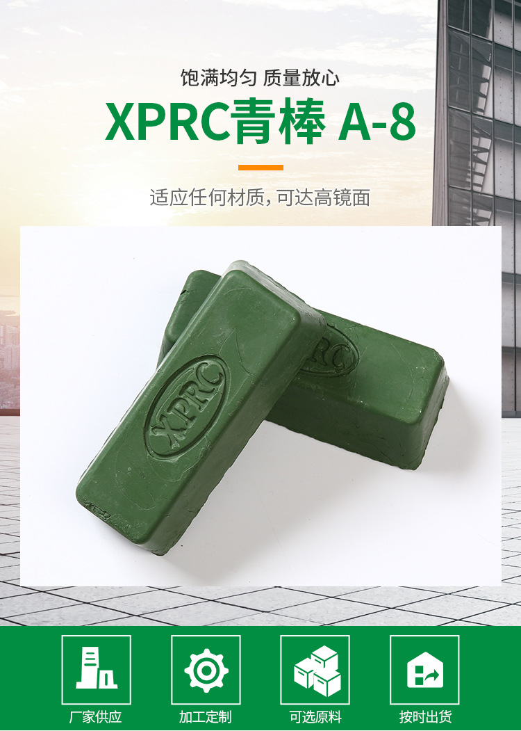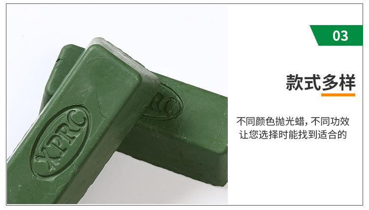 XPRC青臘A-8的一般情況下用不同的顏色表示不同品種的拋光蠟,避免使用時混亂。高含量的磨料可以加速整個拋光過程。這個過程是拋光蠟拋光輪表面移動而使材料變得光滑。